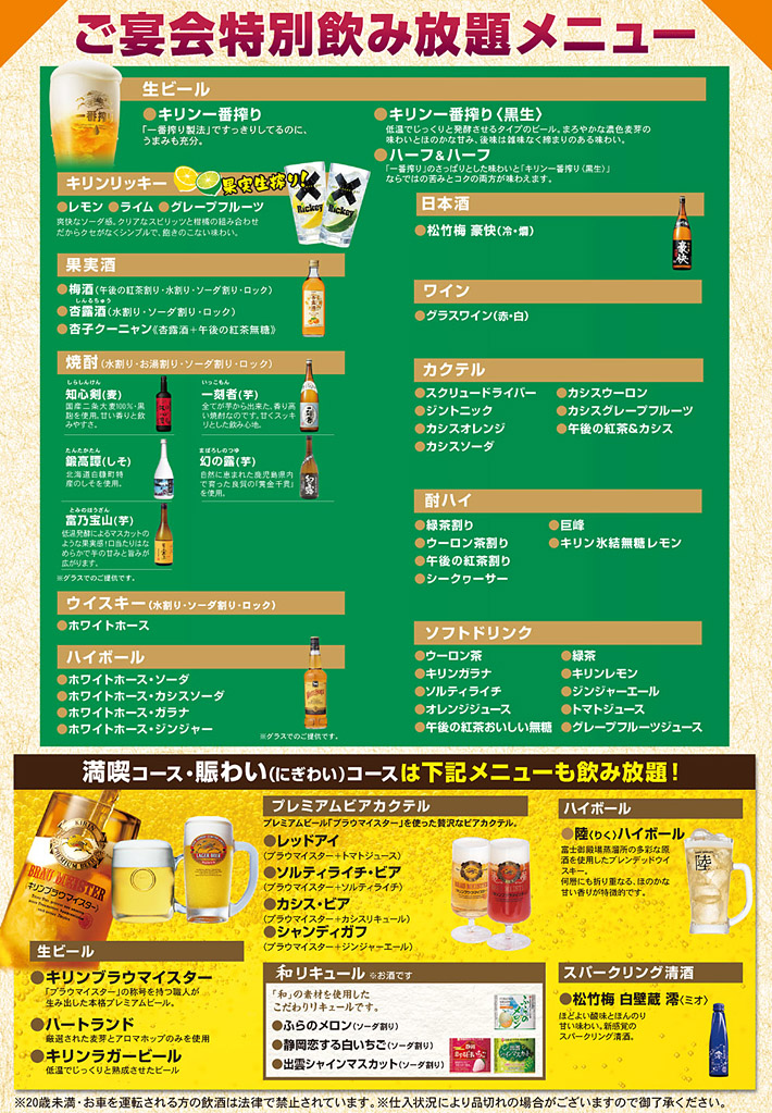 ※飲み放題は、グループ様、皆様統一とさせて頂きます。※飲み放題はグラス交換制とさせて頂きます。※飲み放題のラストオーダーは、10分前とさせて頂きます。※20歳未満・お車を運転される方の飲酒は法律で禁止されています。